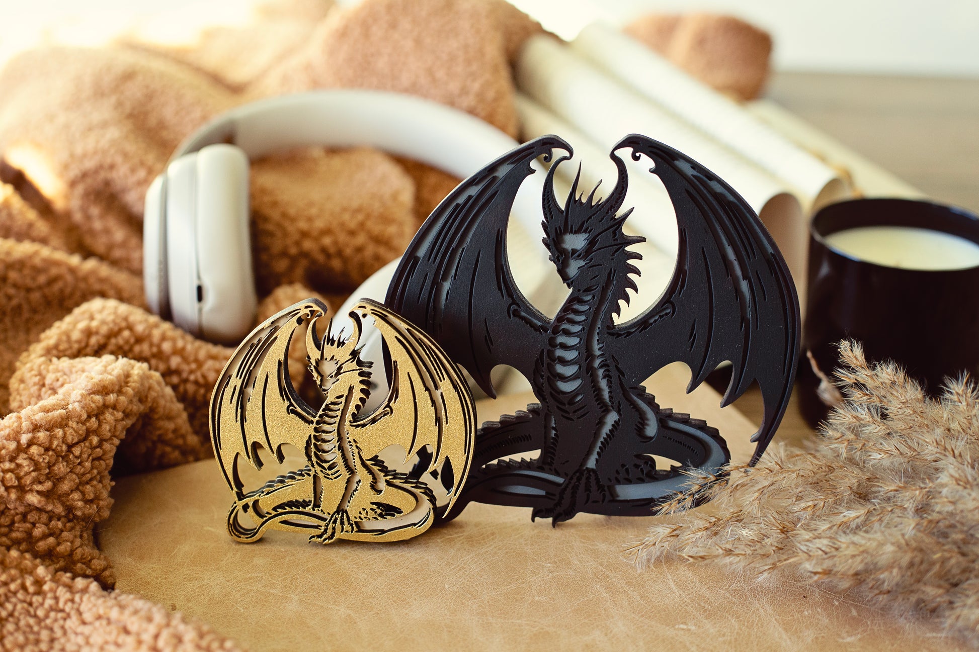 This dragon stand is the perfect accent for any room. It adds a special touch to any bookshelf or wall display. Its natural woodgrain finish adds warmth and texture to any decor. Show off your style with this unique and stylish sign.